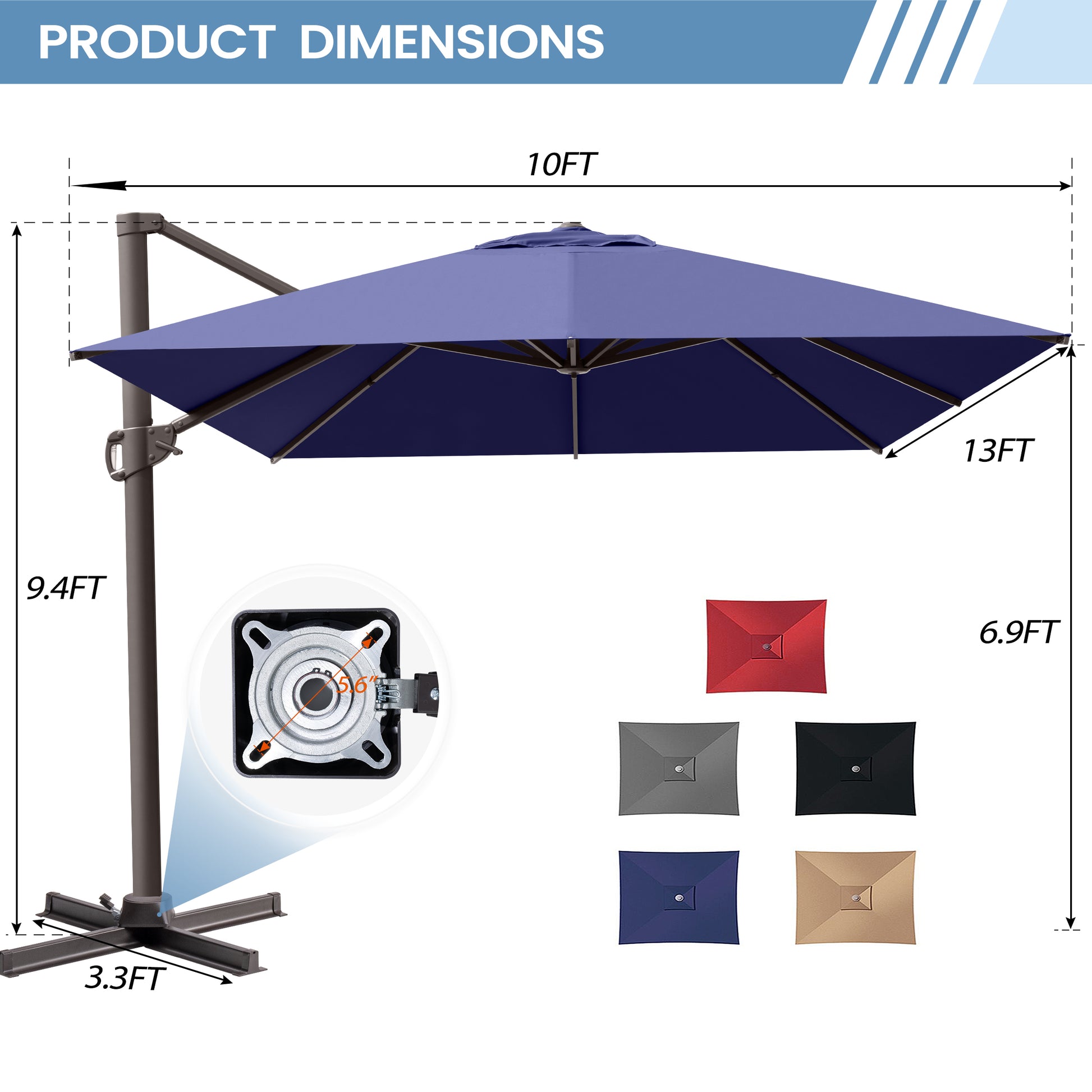 Dimensions: Overall size—canopy: 10 x 13 ft; top height: 9.1 ft. Note: The umbrella should be lowered and secured in windy conditions or when not in use.