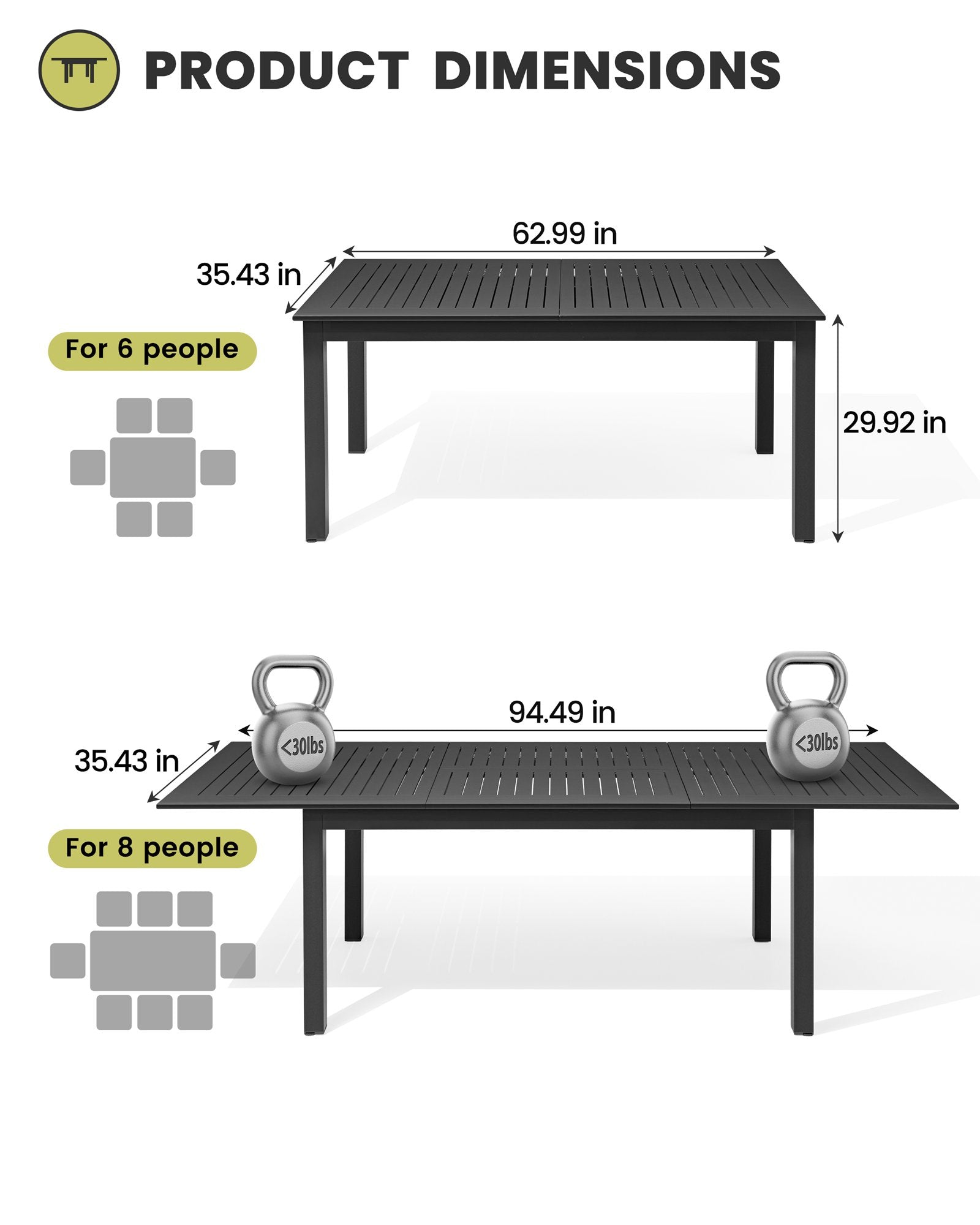 Expandable Dining Table for 6-8: Before expansion, the table measures 62.99" (L) x 35.43" (W) x 29.92" (H), and with a simple extension, it reaches 94.49" in length. It allows you to easily adjust the table size for intimate dinners or larger gatherings, making it ideal for any outdoor occasion.