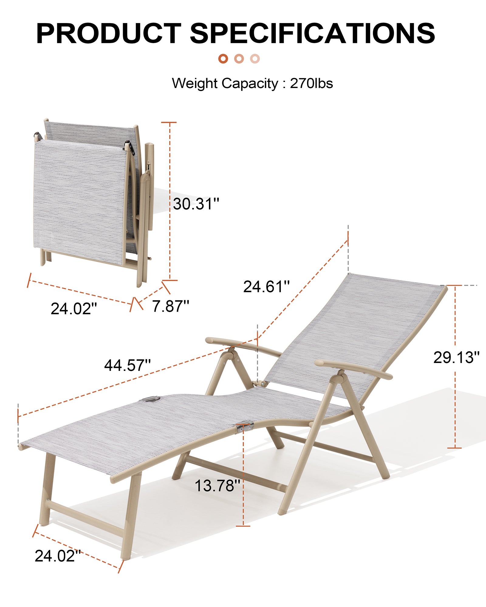 Sturdy Aluminum Frame: Built with a high-strength aluminum frame, this lounger and table set provides reliable stability and supports up to 270 lbs. Relax with peace of mind knowing your chair is both strong and long-lasting. Note: The steel curved front crossbar and connector may rust if wet; dry them after use to prevent this.