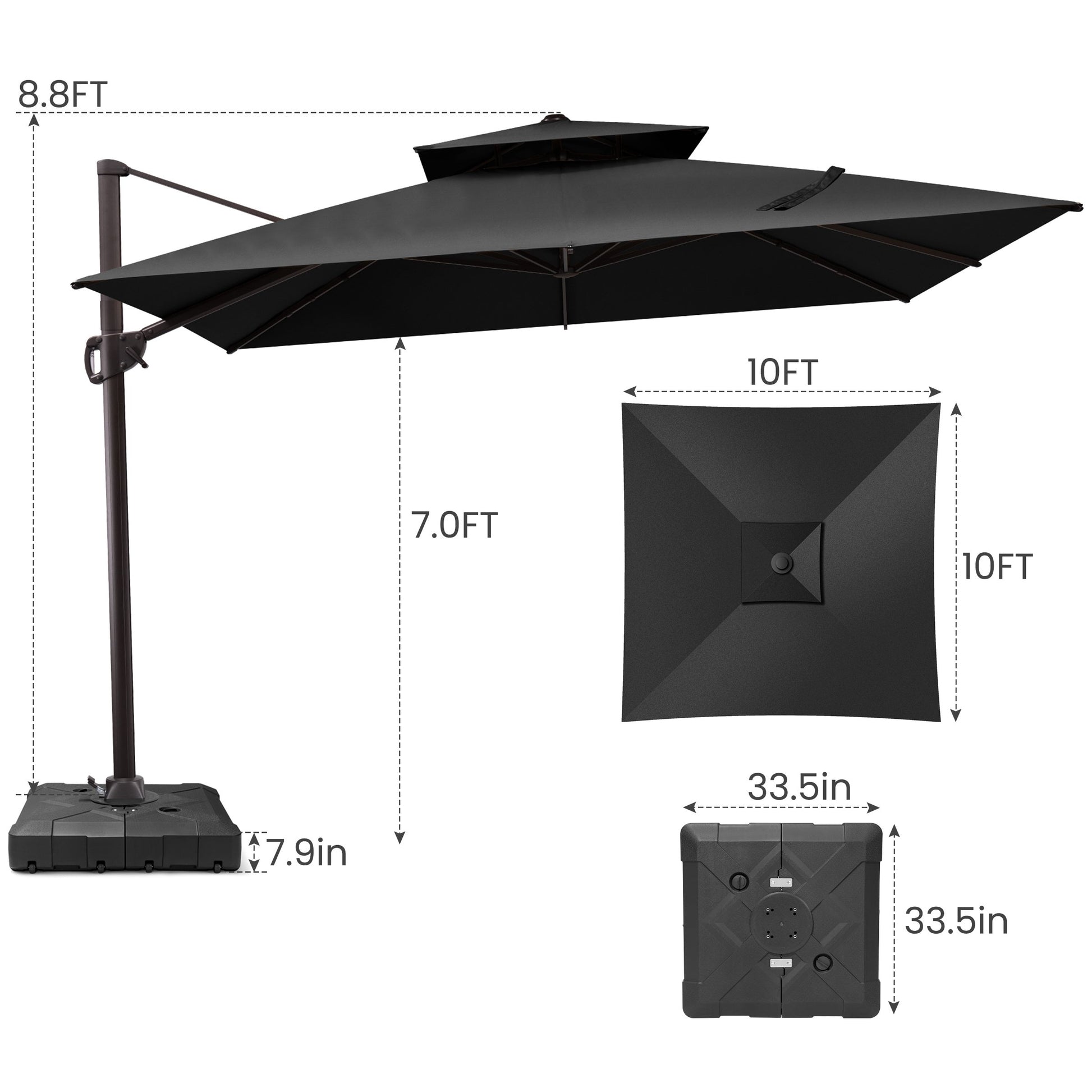 Dimensions: Canopy dimension: 10 x 10 ft; height from top to ground: 8.8 ft; cross base: 3.3 ft. Note: The umbrella should be lowered and secured in windy conditions or when not in use.