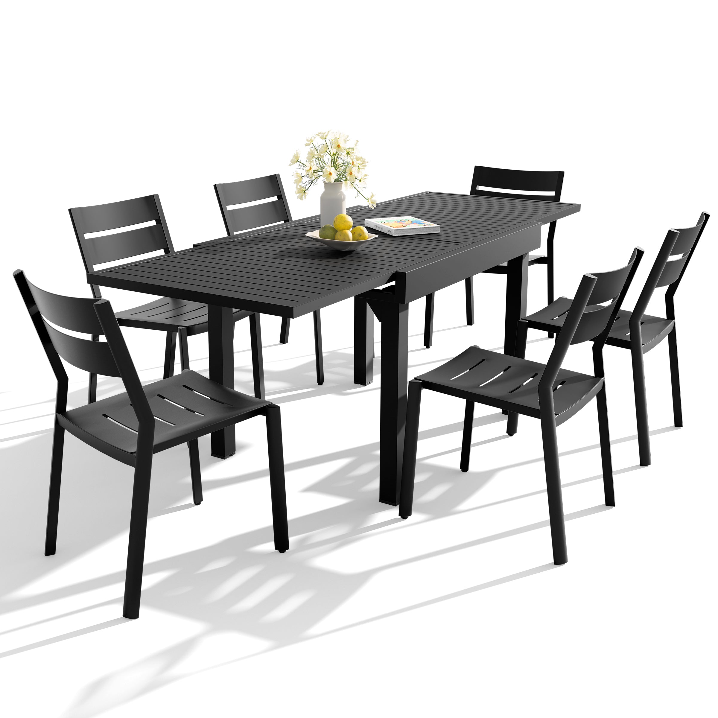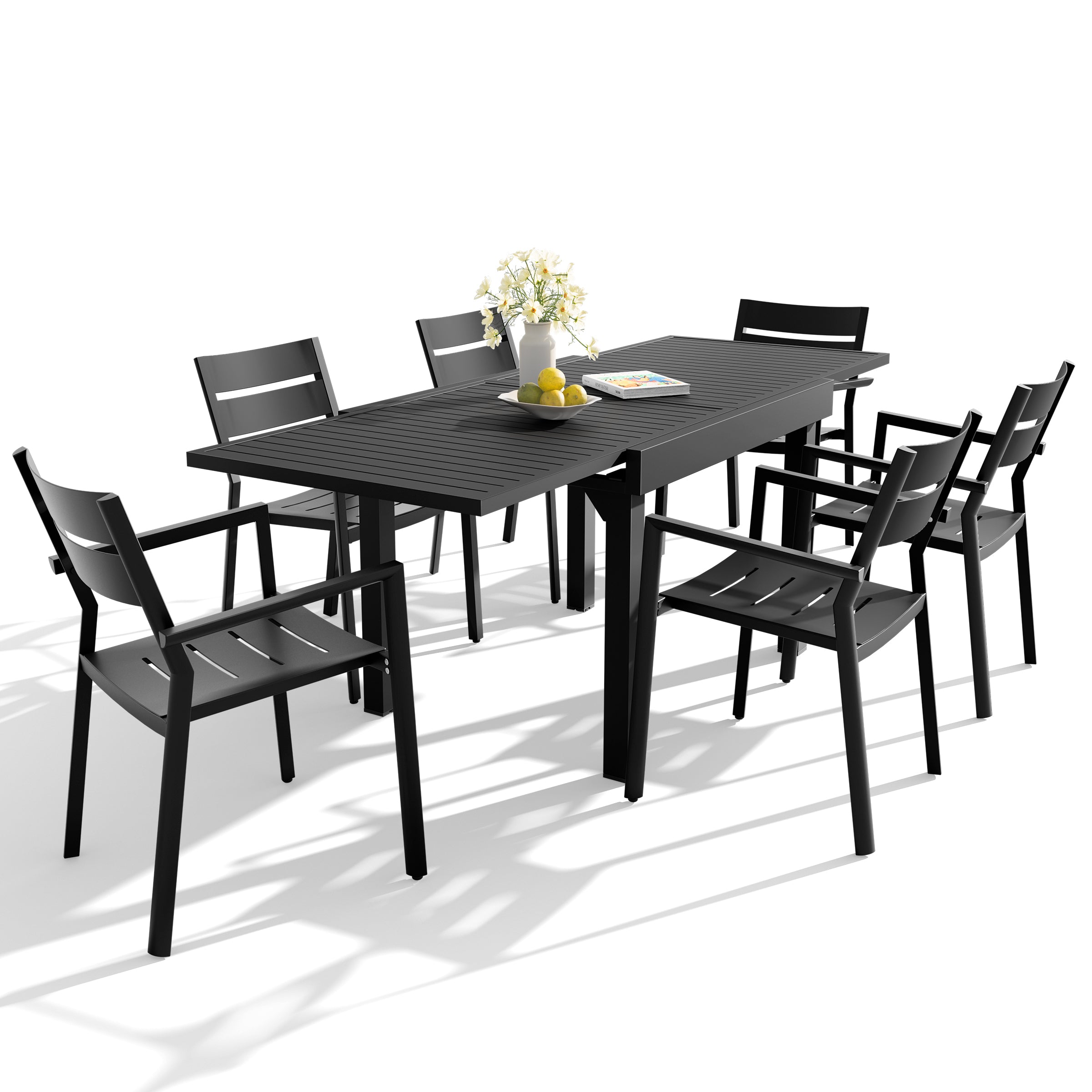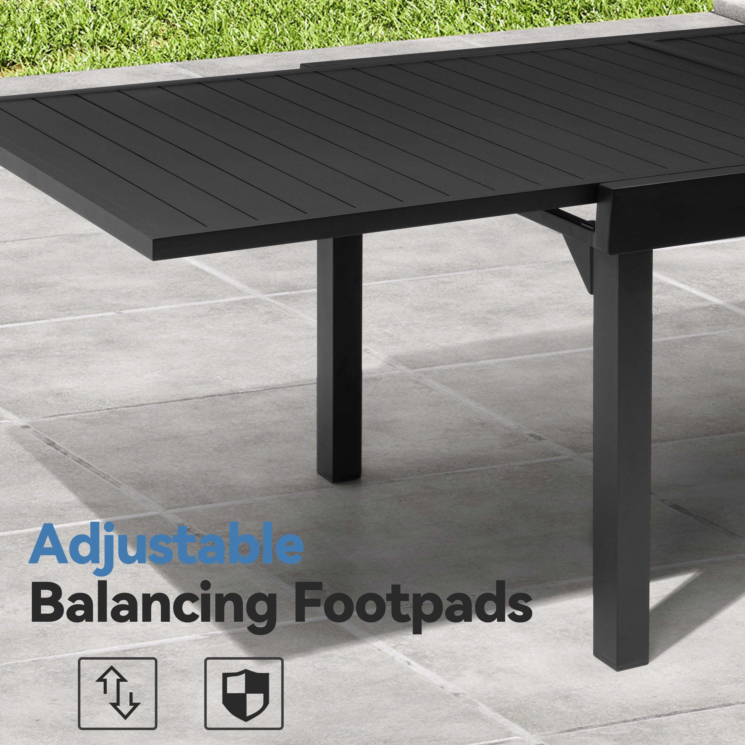 This expandable aluminum patio dining table adapts effortlessly to different occasions. Available in multiple extension options, it adjusts from a compact size to a larger tabletop, comfortably accommodating 4–10 people for everyday dining or larger outdoor gatherings. The chairs are stackable, making it easy to store and save space when not in use.