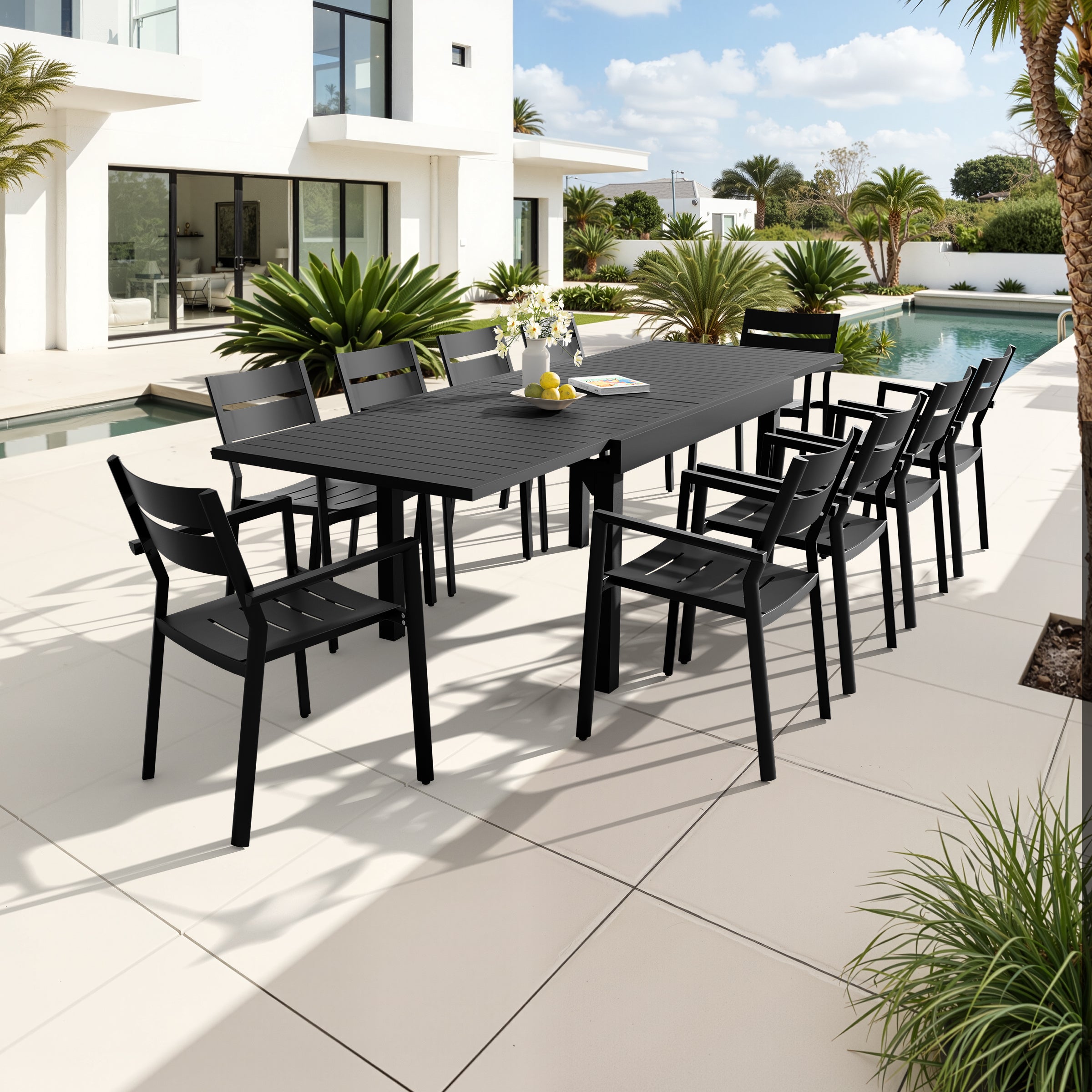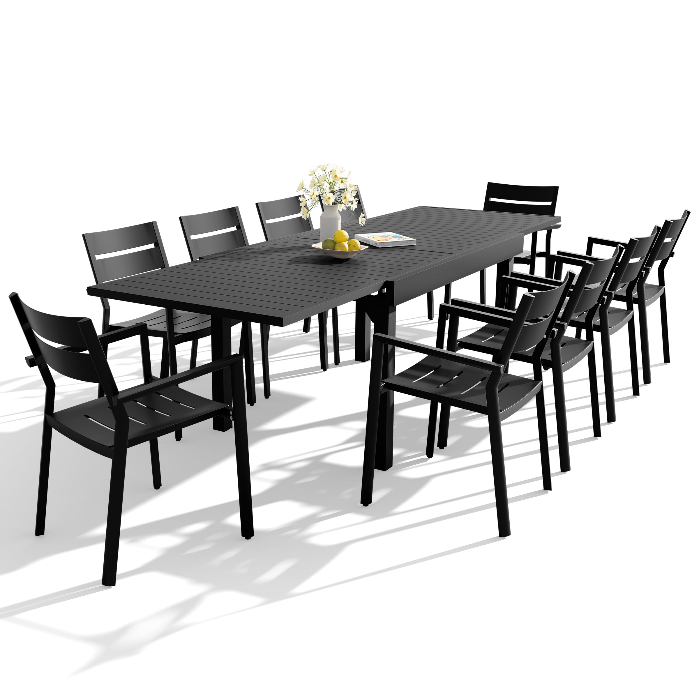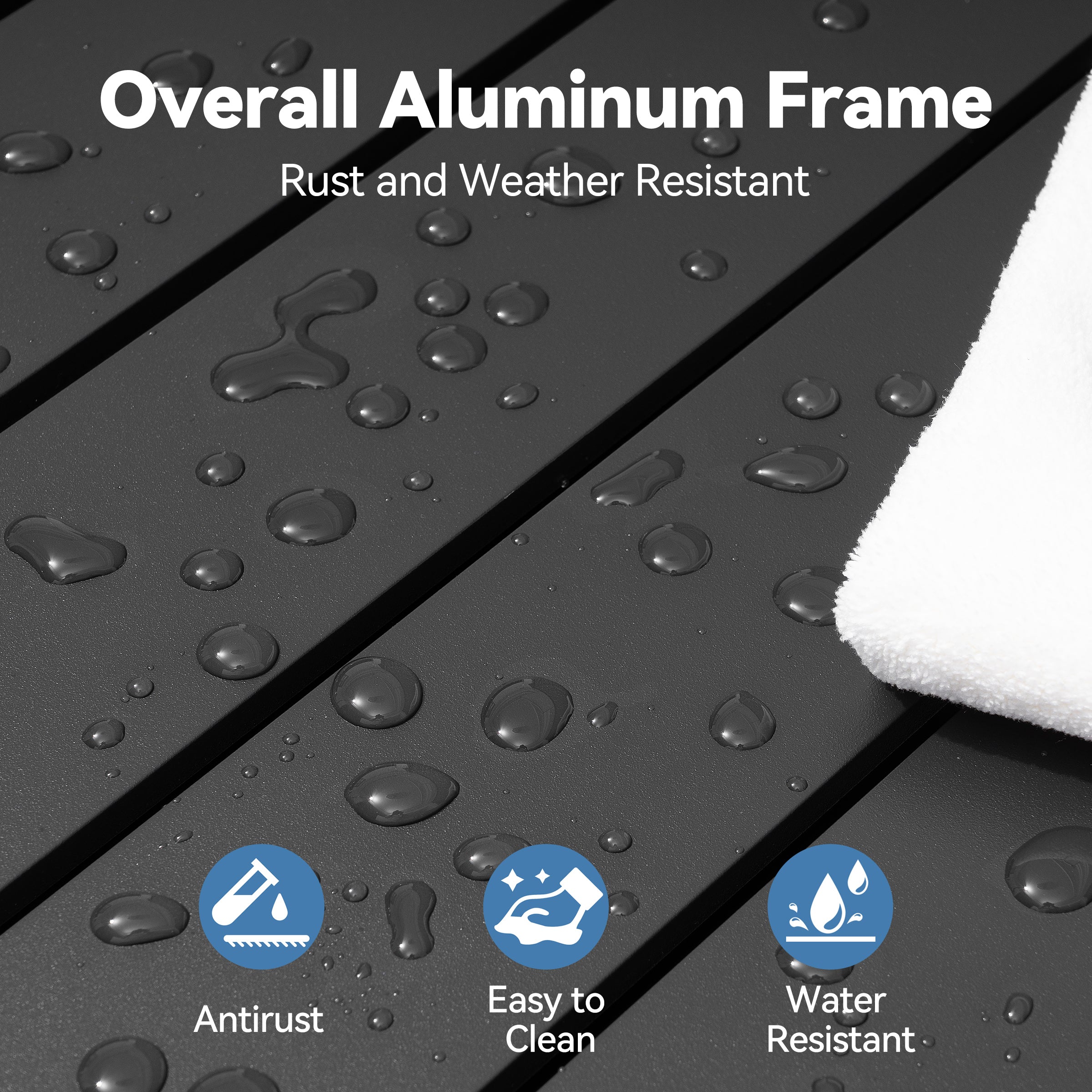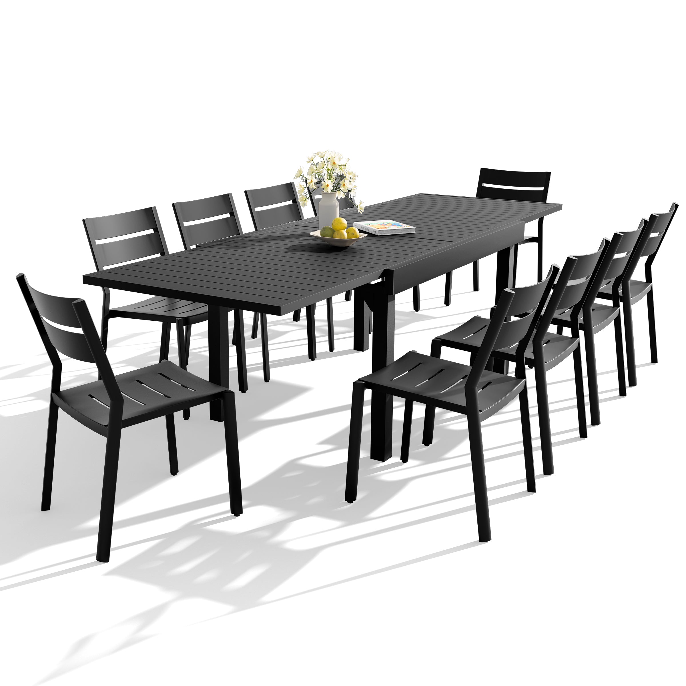 This expandable aluminum patio dining table adapts effortlessly to different occasions. Available in multiple extension options, it adjusts from a compact size to a larger tabletop, comfortably accommodating 4–10 people for everyday dining or larger outdoor gatherings. The chairs are stackable, making it easy to store and save space when not in use.