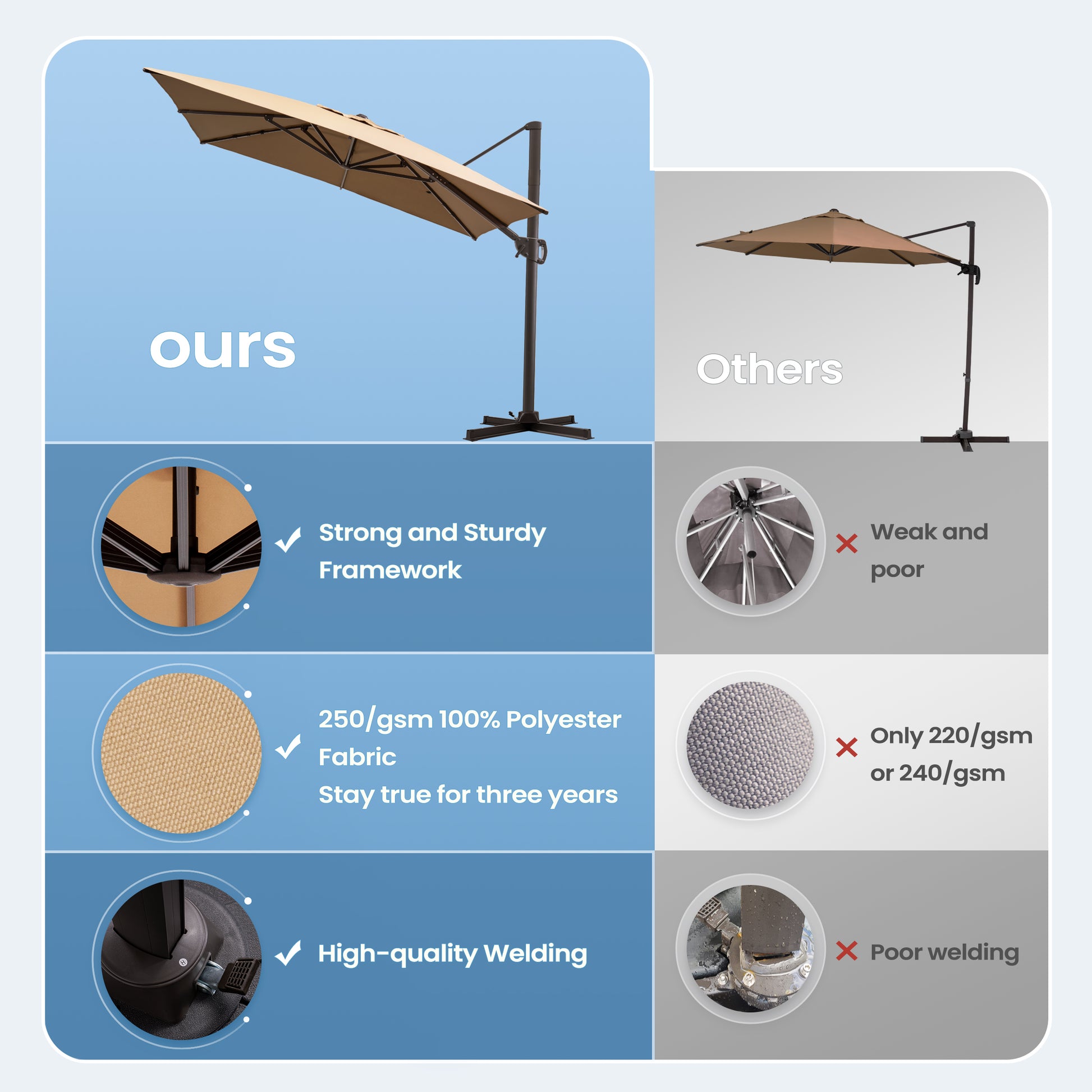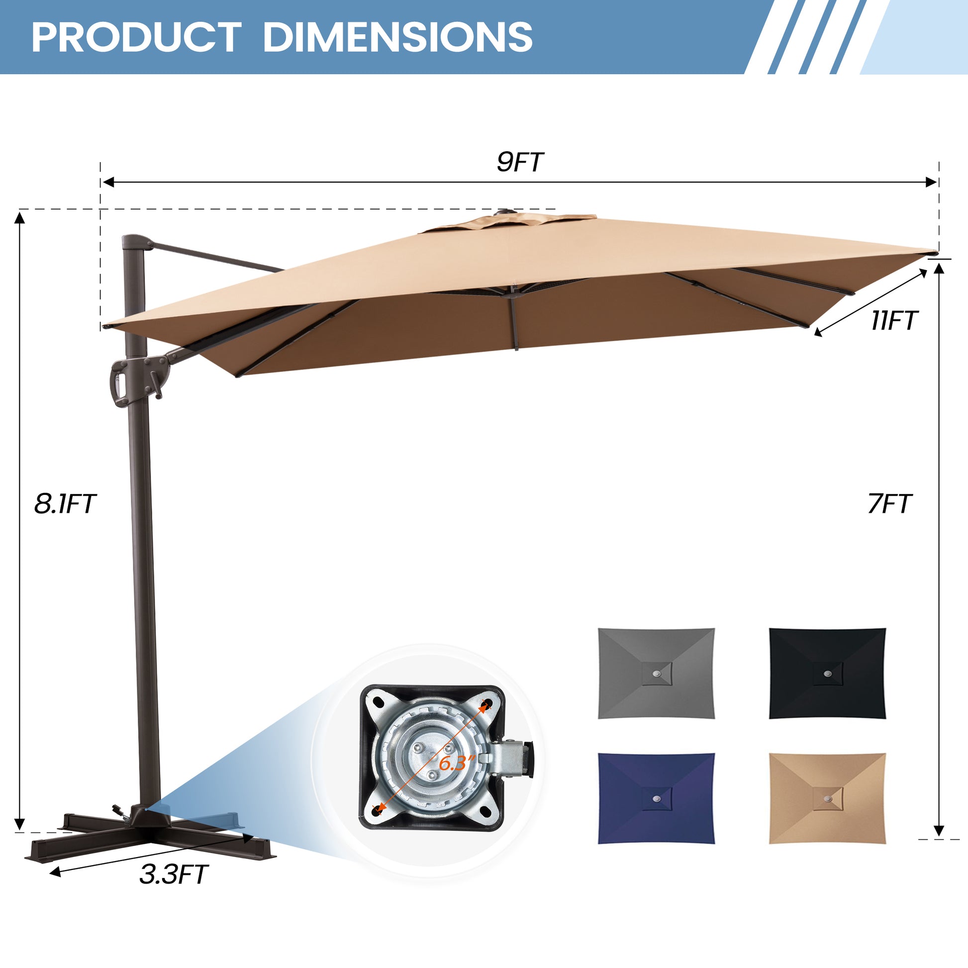 Ample Shade Coverage: Relax under the 9 x 11 ft cantilever canopy, ideal for patios, gardens, decks, poolside lounges, or backyard gatherings. Note: Base not included; select your preferred base option from the product settings.