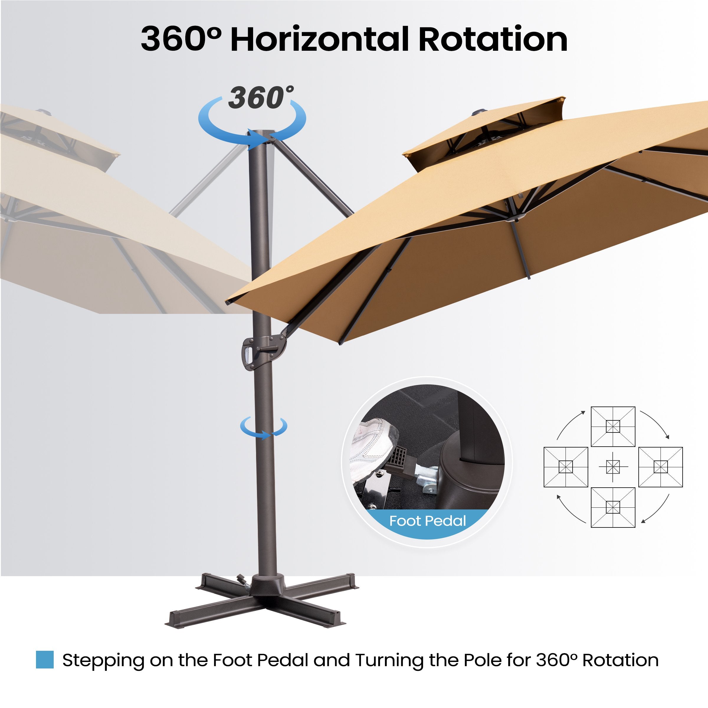 Multi-Angle Tilt & 360° Rotation: With the 5-level tilt mechanism, you can easily adjust the canopy angle at any time. Combined with the foot-pedal rotation system, the umbrella provides full 360° shade coverage, keeping you protected from sunrise to sunset.