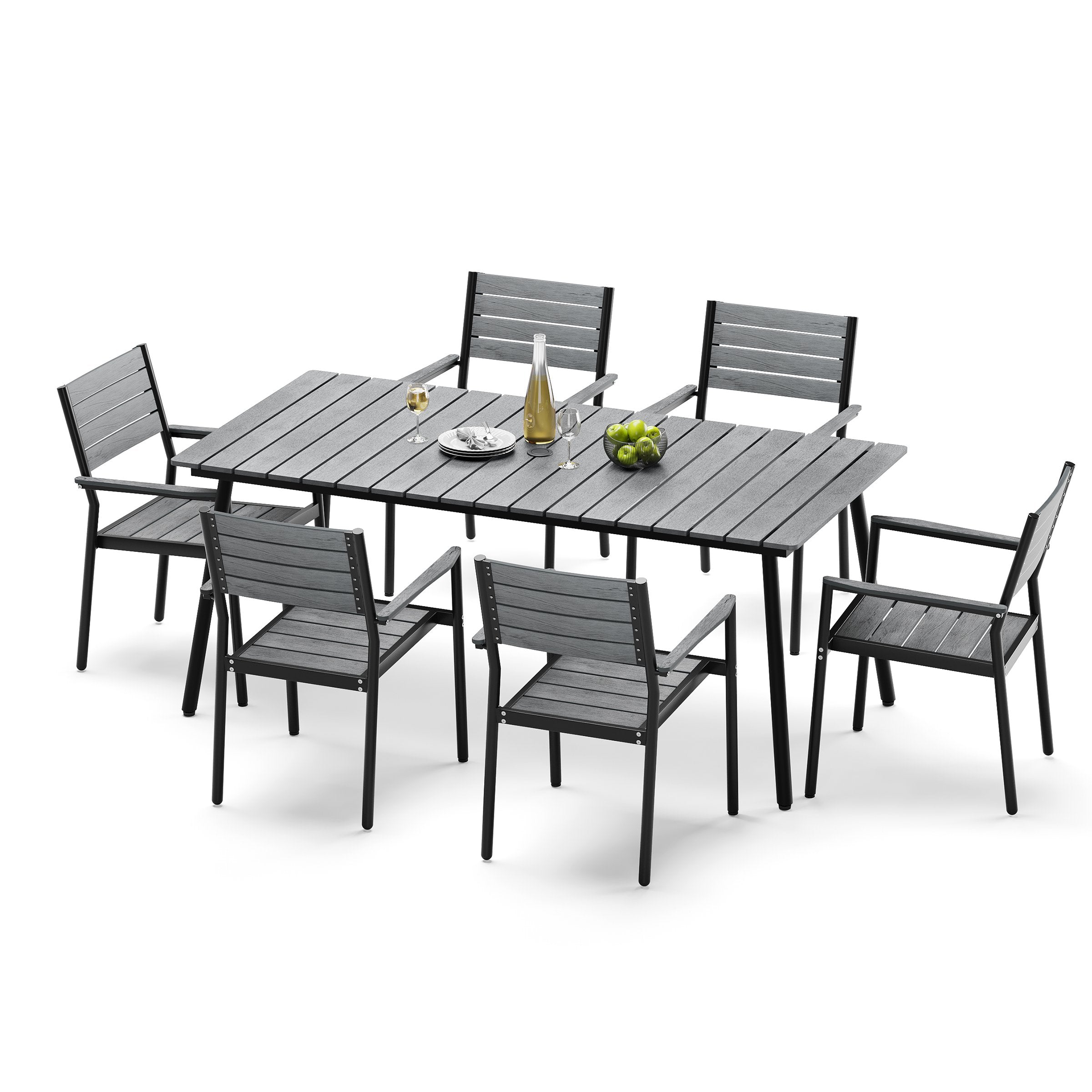 Durable Materials: The tabletop, seat, and backrest use wood-like WPC boards for a natural appearance and dependable strength. A rust-proof aluminum frame delivers long-lasting outdoor durability, while adjustable foot pads keep everything steady on uneven ground.