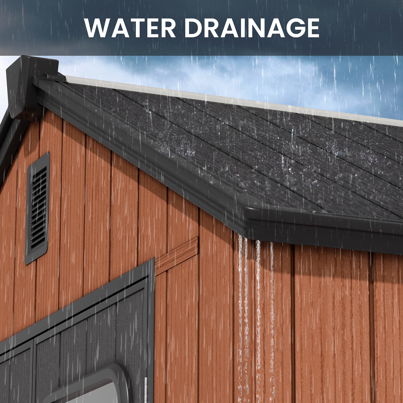 Weather-Resistant Design: The sloped roof and four built-in drainage channels effectively guide away rain and snow to keep the interior dry. A translucent skylight panel allows natural light inside, while the waterproof floor prevents moisture and mold from forming.