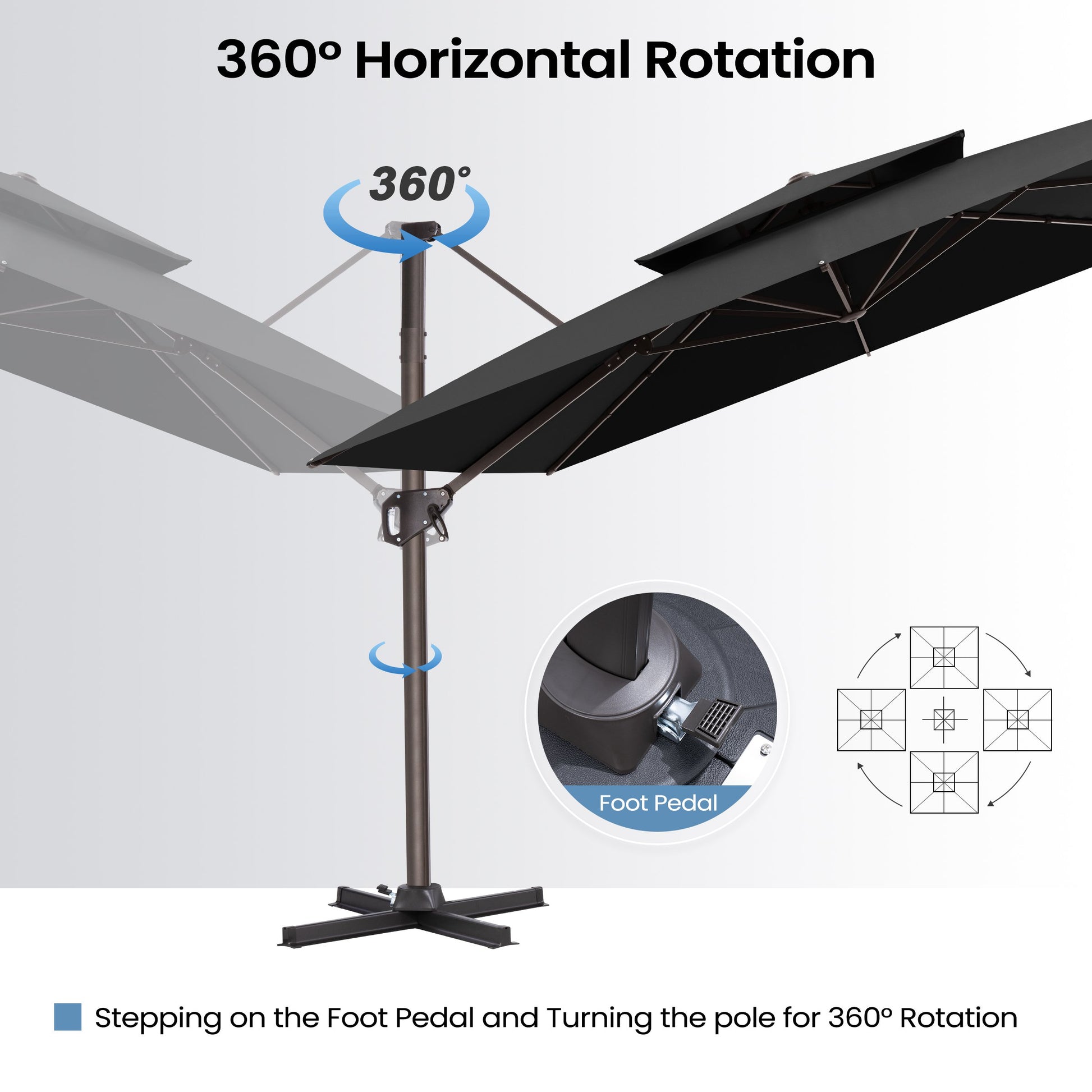 Flexible Tilt & Rotation Design: Customize your shade effortlessly with the 6-position tilt handle, or use the convenient foot pedal to rotate the umbrella a full 360°—providing complete coverage and comfort from morning to evening.