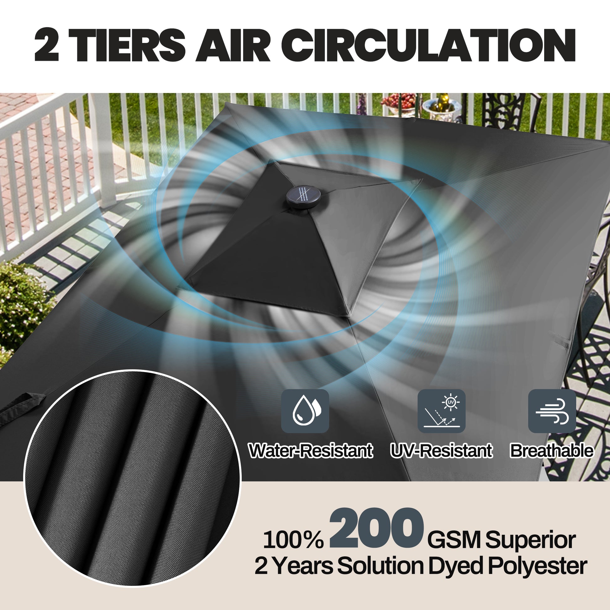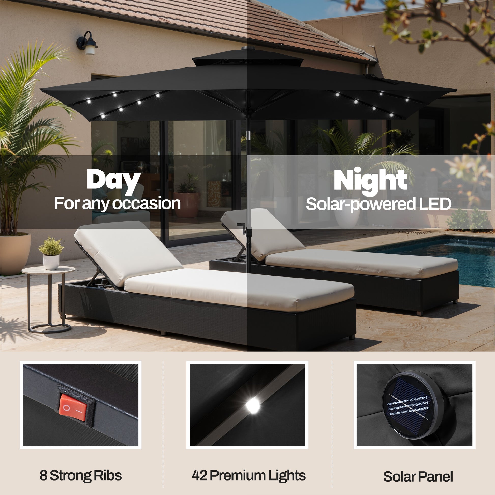 Built-in LED Lights: Picture unwinding on your patio as soft, warm lights brighten your evenings—ideal for cozy nights or hosting friends.