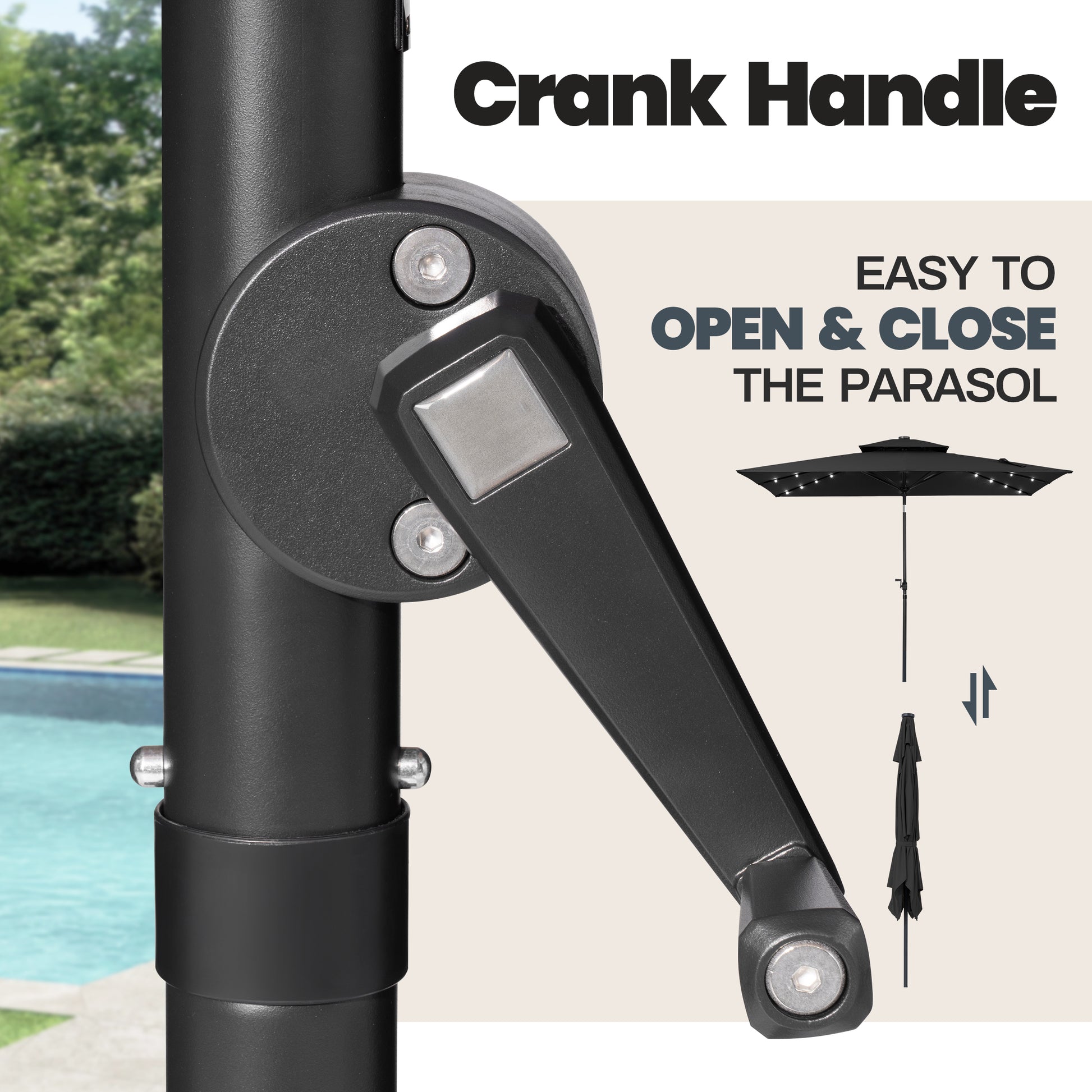 Metal Frame & Easy Crank System: Made with a rust-resistant, powder-coated metal frame and eight durable ribs for lasting strength. The smooth crank handle makes it easy to open, close, and adjust the umbrella to the perfect angle whenever you need.