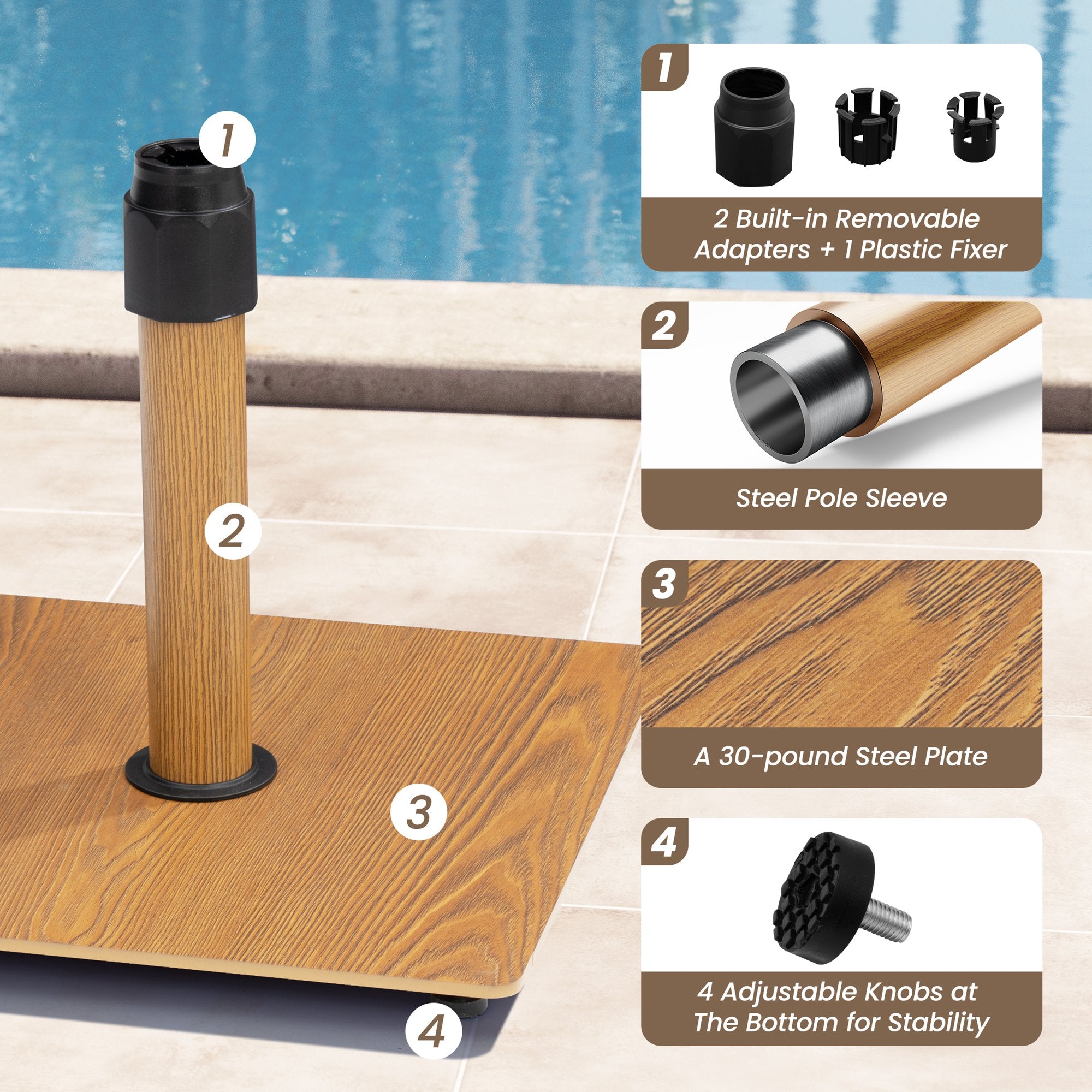Versatile Umbrella Compatibility: Comes with three adjustable adapters to fit umbrella poles measuring 1.4"-1.9" in diameter. Note: please measure your umbrella pole in advance and select the appropriate top cap for a secure fit.