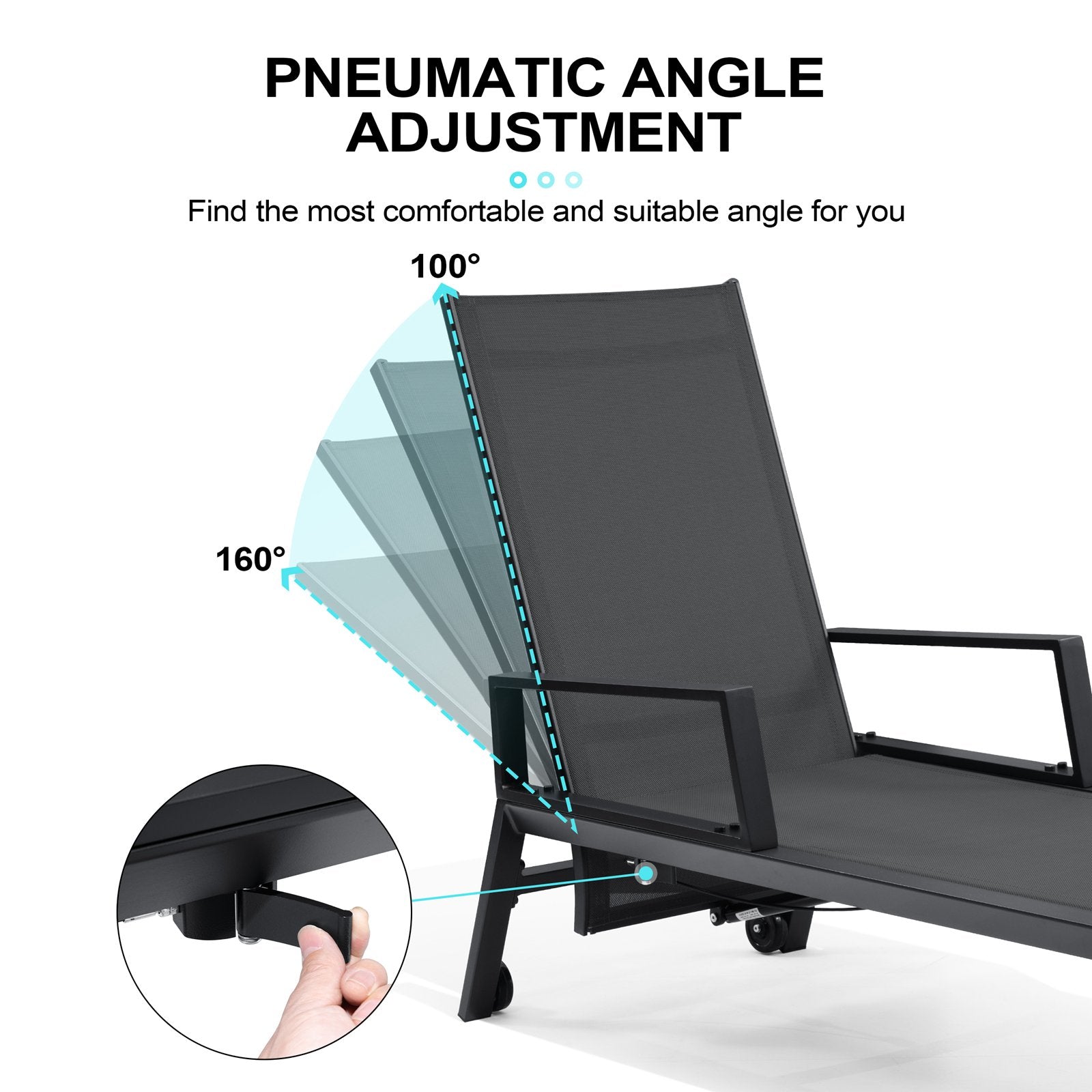 【Air-Pressure Infinite-Adjustment Backrest Angle】The outdoor chaise lounge is equipped with an adjustable air-pressure backrest. When lying down, you can manually press the backrest to adjust it to any desired angle, meeting all your needs. (Note: This lounge chair cannot be placed vertically or lie completely flat.)